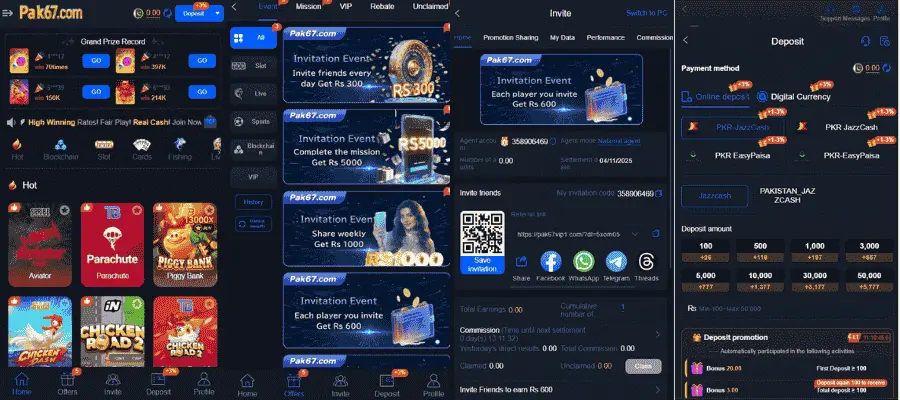 The Pak67 Game is introduced for Android users so download and play multiple casino games. Furthermore, bind your withdraw account for quick withdrawals. Get Rs600 at each invite. Join invitation event share weekly and earn Rs1000. Start games of your choice and win real cash prizes. Complete invitation mission and get Rs5000. Receive money on prizes on first deposit.
